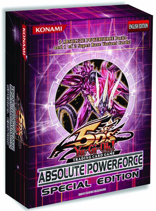 This 100-card set with new trump cards used by Yusei and Jack, the new Dragons of Rex Goodwin, a brand new X-Saber Synchro Monster, plus other new cards for X-Sabers, Reptiliannes, Koa'ki Meiru, Ritual Monsters, Earthbound Immortals, Psychics, and more. Includes 3 packs of Absolute Powerforce as well as 1 of 2 random promo Super Rare cards!