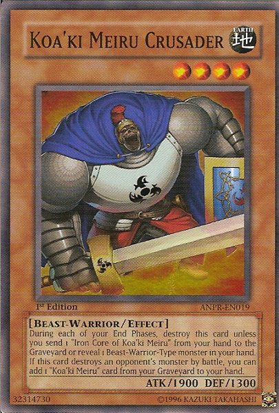 "During each of your End Phases destroy this card unless you send 1 "Iron Core of Koa'ki Meiru" from your hand to the Graveyard or reveal 1 Beast-Warrior-Type monster in your hand. If this card destroys an opponent's monster by battle, you can add 1 "Koa'ki Meiru" card from your Graveyard to your hand."