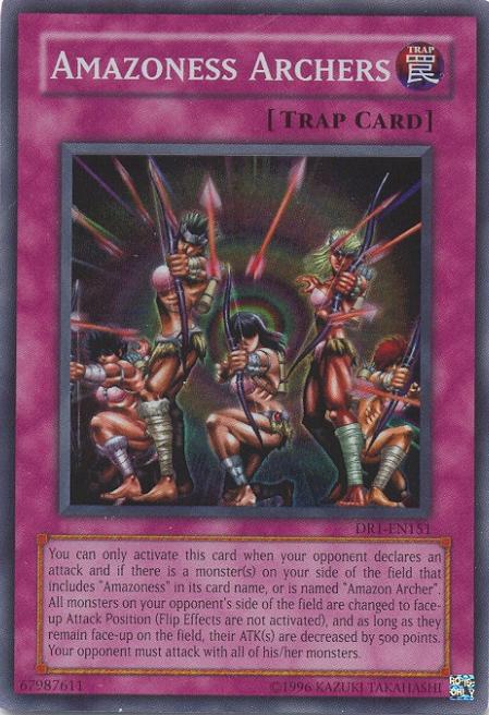 You can only activate this card when your opponent declares an attack and if there is a monster on your side of the field that includes "Amazoness" in it's card name, or is named "Amazon Archer". All monsters on your opponent's side of the field are changed to face-up Attack Position (Flip Effects are not activated), and as long as they remain face-up on the field, their ATK(s) are decreased by 500 points. Your opponent must attack with all of his/her monsters.