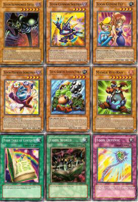 You get ALL 9 of the following TOON Common Cards in this very Affordable Collector's Set!SDP-024 Toon World, SDP-021 Toon Summoned Skull, SDP-022 Manga Ryu-Ran, DB2-EN117 Toon Goblin Attack Force, DB2-EN118 Toon Cannon Soldier, DB2-EN119 Toon Gemini Elf, DB2-EN120 Toon Masked Sorcerer, DB2-EN121 Toon Table of Contents & DB2-EN122 Toon Defense.