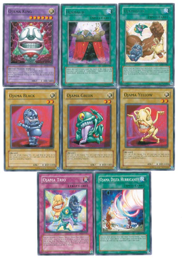 DP2-EN015 Ojama King, DP2-EN020 Ojamagic (RARE), DP2-EN021 Ojamuscle (RARE), DP2-EN004 Ojama Black, DP2-EN002 Ojama Green, DP2-EN003 Ojama Yellow, DP2-EN027 Ojama Trio & DP2-EN018 Ojama Delta Hurricane