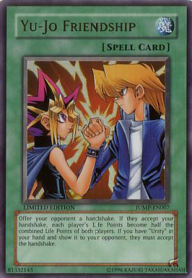 "Offer your opponent a handshake. If they accept your handshake, each player's Life Points become half the combined Life Points of both players. If you have 'Unity' in your hand and show it to your opponent, they must accept the handshake."