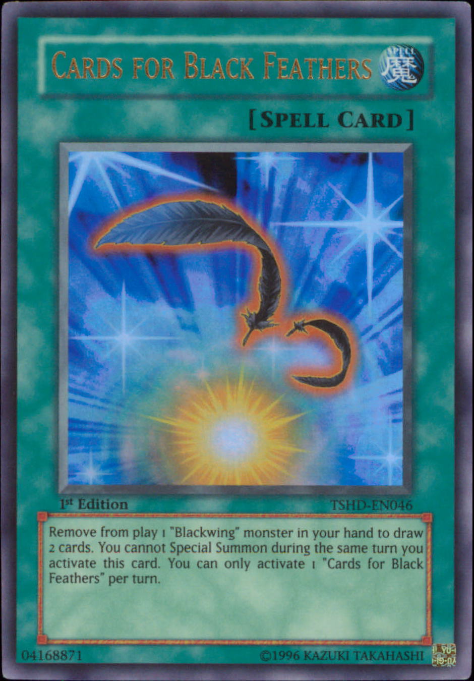 "Remove from play 1 "Blackwing" monster in your hand to draw 2 cards. You cannot Special Summon during the same turn you activate this card. You can only activate 1 "Cards for Black Feathers" per turn."